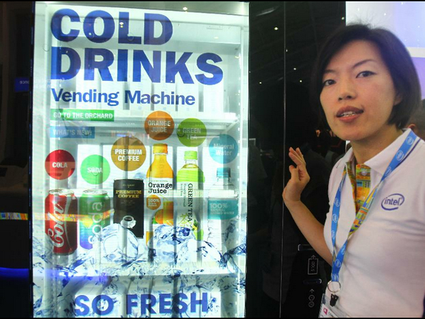 Intel ha desarrollado una nueva máquina de vending interactiva equipada con el procesador Intel Core i5 de 2ª generación y una pantalla OLED transparente y táctil que permite que los consumidores vean los productos que contiene la máquina al tiempo que visualizan información sobre ellos.