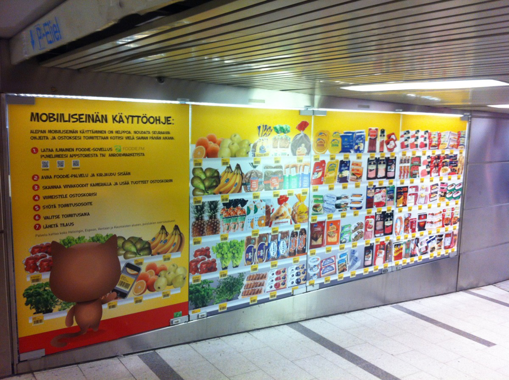 Digital Foodie, una empresa finlandesa con sede en Helsinki, ha estado trabajando junto con la Sociedad Cooperativa Elanto de S Group, para convertir las paredes de algunos de los espacios más concurridos de la capital de Finlandia en tiendas virtuales. それで, las paredes han cobrado vida con displays virtuales que muestran una selección de productos con códigos de barras que los clientes pueden escanear con sus smartphones utilizando la aplicación de shopping Foodie.fm para recibir dichos productos a domicilio. Los pedidos que se realicen antes de las 3 de la tarde se entregan en el mismo día.