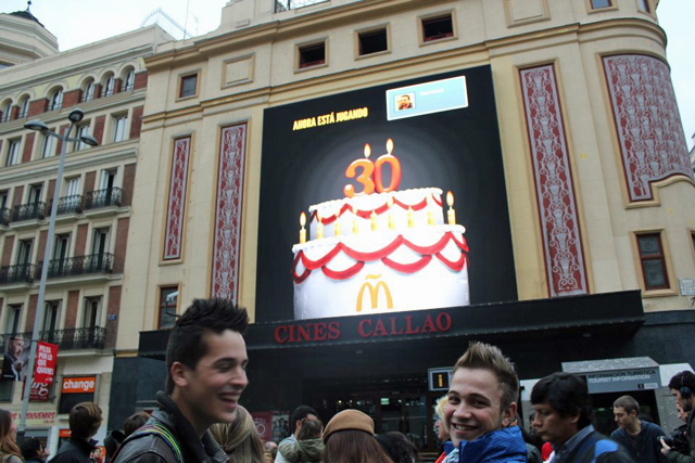 の記念日に 30 マクドナルドの数年間, カヤオ広場では、インタラクティブスクリーンに映し出されたバーチャルケーキのろうそくの火を吹き消すよう人々を促すアクションが発生しました。. iPhone および Android デバイス向けに開発された拡張現実アプリケーションのおかげで, 会議の出席者は QR コードで画面に接続できました, APPアプリケーションをダウンロードする, Facebook プロフィールを通じて、バースデー ケーキのキャンドルを大量に吹き消すイベントにライブで参加し、ファーストフード レストラン チェーンの施設で引き換えられる賞品にアクセスしましょう.