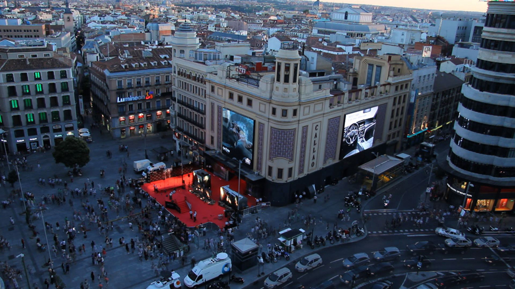 新たな大型インタラクティブ広告媒体の誕生, 多くの文化的および商業的可能性を促進します, 広告主とプラザの訪問者の両方にとって, これは、マドリッドの最も象徴的な地域の 1 つに対する市民の活性化と映画の世界への取り組みを表しています。. これは、ブランドが消費者にアプローチする方法におけるイノベーションへの取り組みでもあります。, 路上などの公共のオープンスペースで彼らと交流する. これは、3 つの異なるシナリオで双方向性を同時に提供できる独自の通信モデルです。: 広場, スクリーンとインターネット.