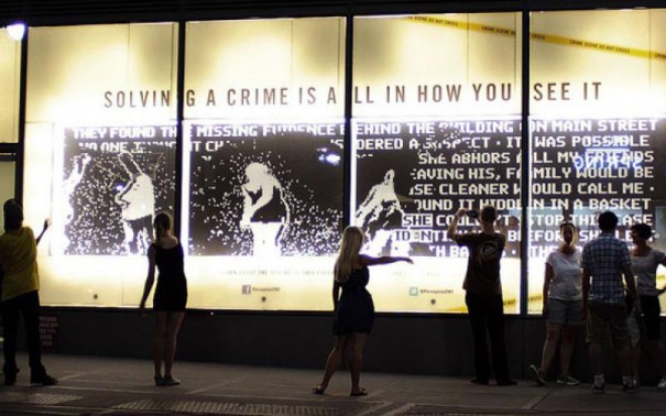 Este exclusivo anuncio detecta los movimientos de los que pasan y les muestra, リアルタイムで, un reflejo de sus reacciones en blanco y negro. Los espectadores pueden utilizar el movimiento de su cuerpo para borrar las palabras de la pantalla que, それで, deja pistas específicas. Esta animación tiene la intención de recrear la capacidad para resolver crímenes que posee el protagonista de Perception, interpretado por Eric McCormack, un profesor que es reclutado por el FBI para resolver crímenes viendo significados ocultos en los mensajes a través de anagramas.