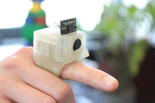 Los investigadores del MIT Media Lab (Instituto de Tecnología de Massachusetts, 欧州連合) han desarrollado un anillo de realidad aumentada equipado con una pequeña cámara, un procesador, conectividad Bluetooth y retroalimentación auditiva a través de un dispositivo portátil, que podría ayudar a los discapacitados visuales a identificar objetos y leer texto.