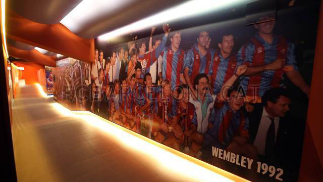 En el pasillo inmediato que da acceso al túnel se ha querido rendir un homenaje a los cuatro equipos que han conseguido la Liga de Campeones. それで, aparecen las cuatro imágenes de las plantillas con el título europeo: el ‘dream team’ de Cruyff, en Wembley en 1992; el Barça de Rijkaard, en París en el 2006, y el de Guardiola, que se proclamó campeón de Europa en Roma, その中で 2009, y en Wembley, その中で 2011.