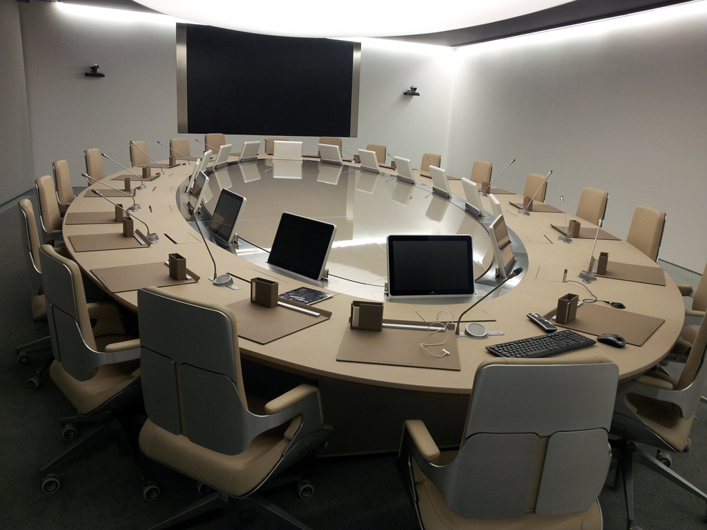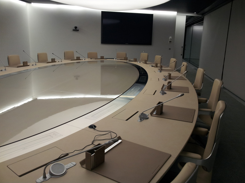 El contraste de los diferentes materiales utilizados tiene como resultado una mesa elegante a la vez que moderna y su forma circular fomenta la participación, conversación e intercambio de información entre los asistentes a la reunión. La mesa está también equipada con sistema de audio conferencia y de cajas empotradas para conexiones. この場合, se ha optado por la instalación de los micrófonos de forma separada y fijos sobre la superficie de la mesa, de modo que están visibles en todo momento. 加えて, se ha instalado un monitor de gran tamaño sobre la pared para reforzar la comunicación.