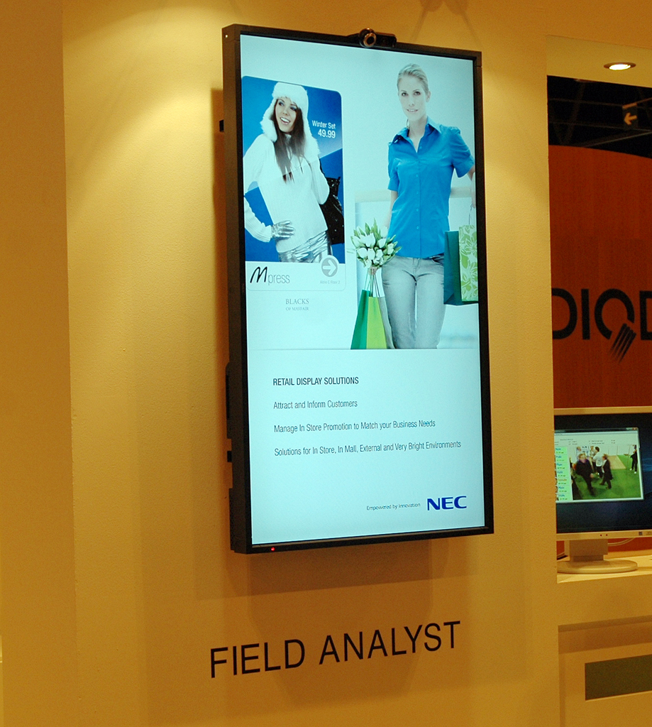 そしてスースタンド, la compañía japonesa está exponiendo la herramienta de medición de audiencia NEC Field Analyst, una innovadora solución enfocada al Retail Signage que permite definir el tipo de público que se sitúa frente a la pantalla y, こちらです, lanzar mensajes publicitarios personalizados y acordes a sus gustos e intereses. Field Analyst es un sistema de reconocimiento facial que permite realizar un seguimiento del público que se sitúa delante de la pantalla para lanzar el mensaje más adecuado a cada perfil.
