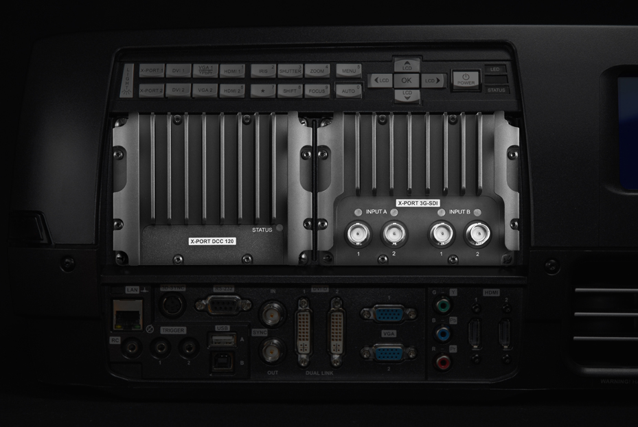 X-Port は、現在および将来のフォーマットとの簡単な接続を可能にする、単一モジュールベースの小型の拡張機能です。, 補足的な画像処理だけでなく. 個別のデバイスはプロジェクターの背面に簡単に接続できます.