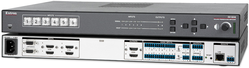 業務用AVシステム製品のメーカー, エクストロン エレクトロニクス, ha incorporado a su portfolio el switcher de presentación de escalado de seis entradas compatible con HDCP IN1606, que incorpora cuatro entradas HDMI, dos entradas de vídeo analógicas universales, y dos salidas HDMI simultáneas, y que acepta una amplia variedad de formatos de vídeo, HDMIを含む, HDTV, RGB y vídeo de definición estándar.