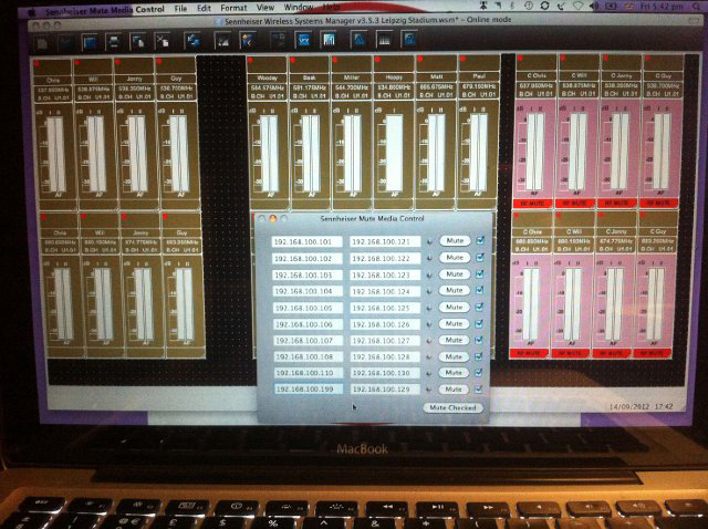 Trabajando de cerca con Ali, Sennheiser diseñó y escribió una aplicación independiente que utiliza el Protocolo de Control de Medios, que permite controlar simultáneamente vía remota las facilidades de RF Mute en múltiples transmisores IEM. “El software significa que es posible tener un conjunto idéntico de transmisores IEM de la serie 2000, en las mismas frecuencias, ubicados en el escenario local en cada extremo del estadio y cambiar a los que están transmitiendo con solo tocar el botón de una computadora portátil. Conforme la banda corre hacia la audiencia a través de los dos escenarios, es posible cambiar la transmisión de radiofrecuencia entre las dos locaciones. Esto significa que la banda escucha una cobertura prácticamente perfecta mientras se mueven entre los escenarios”, ha comentado Ali.