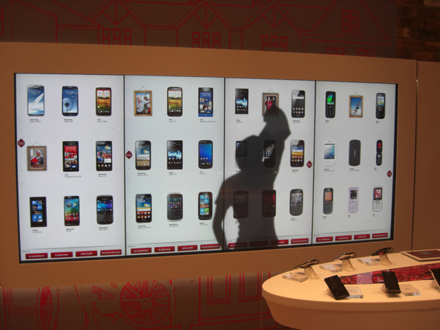 La tienda cuenta con un impresionante videowall de pantalla táctil gigante que muestra los últimos modelos de teléfonos de la compañía. Controlado a través del tacto por un CMS basado en web, los clientes pueden explorar la gama de dispositivos móviles para seleccionar uno y conocer más en detalle las características y precios.