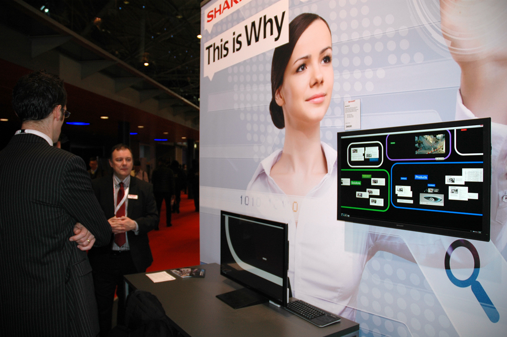 Cada uno de estos mercados está presente en el stand de Sharp, con los productos destacados de la gama de LCD instalados con aplicaciones ‘reales’. 例えば, en la sección de ‘la oficina de futuro’, se muestra el nuevo monitor con tecnología IGZO de 32 インチ. También hay una innovadora área de comercio utilizando la señalización digital para captar la atención de los clientes, y una galería que ofrece una mayor experiencia a los visitantes a través de LCD. その上, en una zona de educación se muestra la atractiva gama de las grandes pizarras interactivas ‘Big Pad’ de Sharp. En ésta área la compañía japonesa demuestra cómo los monitores pueden utilizarse en tándem con tablet PC, para crear una nueva sala de reunión y aplicaciones para la educación.
