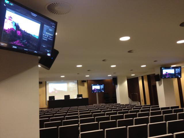 Para la captación de los actos realizados en este auditorio, se han instalado tres cámaras robotizadas de alta definición, gestionadas desde la sala de control por un técnico especializado, mediante una consola de vídeo que se combina con un monitor táctil. En cuanto al sistema de proyección, Ditec Comunicaciones ha optado por la tecnología LCD, ya que con ella se consiguen colores más fieles y más luminosidad en las imágenes. それで, se ha instalado un proyector 3LCD, además de un refuerzo visual para la segunda mitad de la sala con 4 pantallas LCD 42”, y 2 pantallas LCD 55” ubicadas en soportes móviles para las primeras filas.