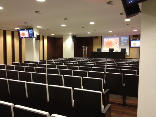 ついに, con el objetivo de gestionar los equipos audiovisuales de forma centralizada, se ha integrado un sistema de control, que incluye un panel táctil que facilita y simplifica la operativa, así como también se ha incluido un sistema de gestión de la iluminación que habilita la automatización y regulación de la iluminación en el auditorio.