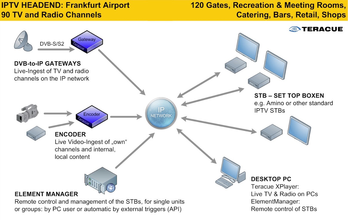 IPTV技術 テラクエ フランクフルト空港は、施設全体にほぼ 100 のラジオおよびテレビ信号を配信できるようになりました。.