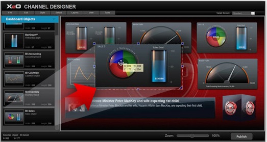 A pivotar sobre HTML 5, esta plataforma cuenta con intuitivas herramientas para arrastrar y soltar lo que permite a los usuarios crear rápidamente canales con vídeo de alta definición, imágenes fijas, animaciones 3D, diapositivas de PowerPoint y gráficos de todo tipo, pudiendo beber de fuentes SAP y Oracle, hojas de cálculo Excel, o canales RSS.