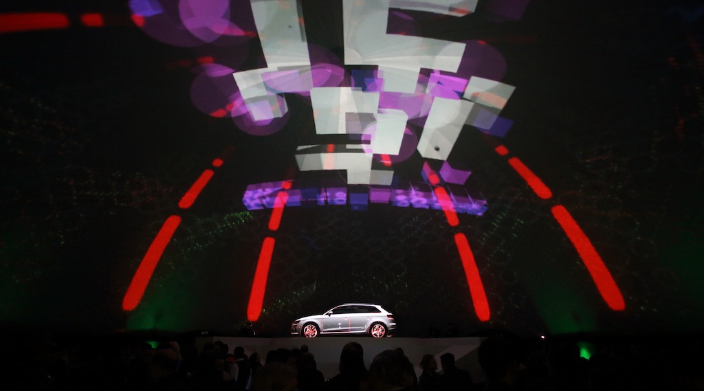 ショーは暗闇の中で始まり、始まりを示すナレーションが流れます. まず、アウディのロゴを構成するリングが一つずつリズミカルに点灯します。, そして、3D マッピング技術を使用してさまざまな光のフラッシュが表示され、それらが互いに接続して無数の発光立方体を生成し、ステージの最初の完全なイメージを形成します。. その後、右から左に線が表示されます。, 素早く動き、新型アウディ A3 スポーツバックの形状を描きます。. 次, アウディ A3 スポーツバックを隠し、シルエットを映し出すフレームがゆっくりとスライドする, 実車に道を譲るために. アイデアは、仮想と現実の間の移行を提供することです.