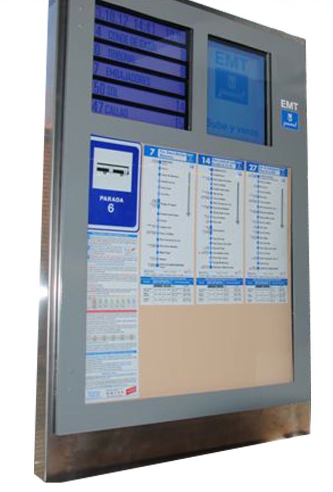 En esas mismas marquesinas se podrán consultar paneles de tinta electrónica. Constan de dos pantallas y un sistema de audio, en los que se dan datos sobre las previsiones de paso de los próximos autobuses y se proporciona información diversa sobre el servicio, con un sistema de voz, que repite los textos de la pantalla en varios idiomas. La tinta electrónica ofrece una óptima visualización en pantalla bajo cualquier condición de luz, requiere un consumo energético muy bajo y asegura, その上, una vida útil muy larga de los paneles.