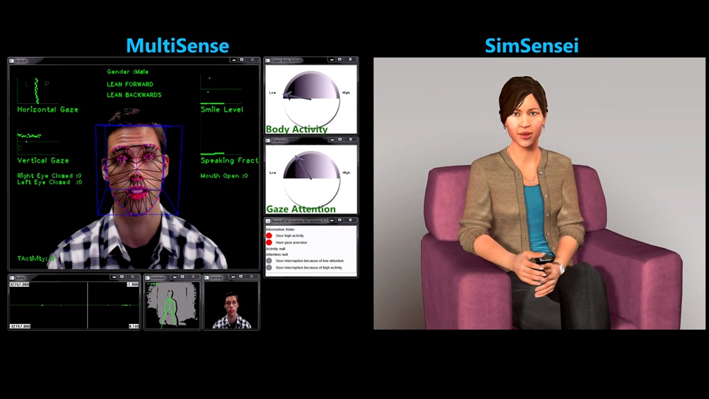 SimSensei permite una interacción cara a cara, en la cual el humano virtual participa y reacciona automáticamente a la situación percibida por el usuario y la intención, a través de su propia voz y gestos.