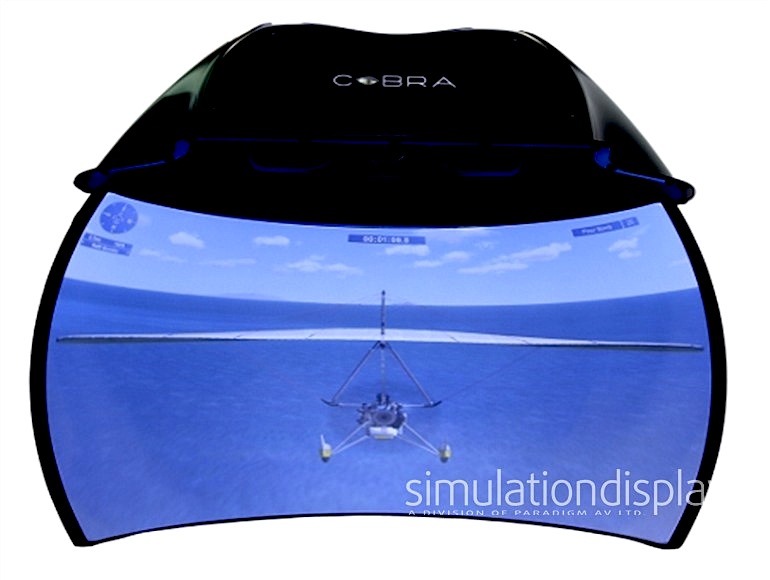 SD Cobre Curved es una pantalla totalmente inmersiva de bajo coste de Simulation Displays (SD), que combina un display panorámico y semiesférico con un proyector, integrado en una pequeña cúpula, que ofrece un campo de visualización de 150 grados en horizontal y 66 垂直方向, 高解像度で.