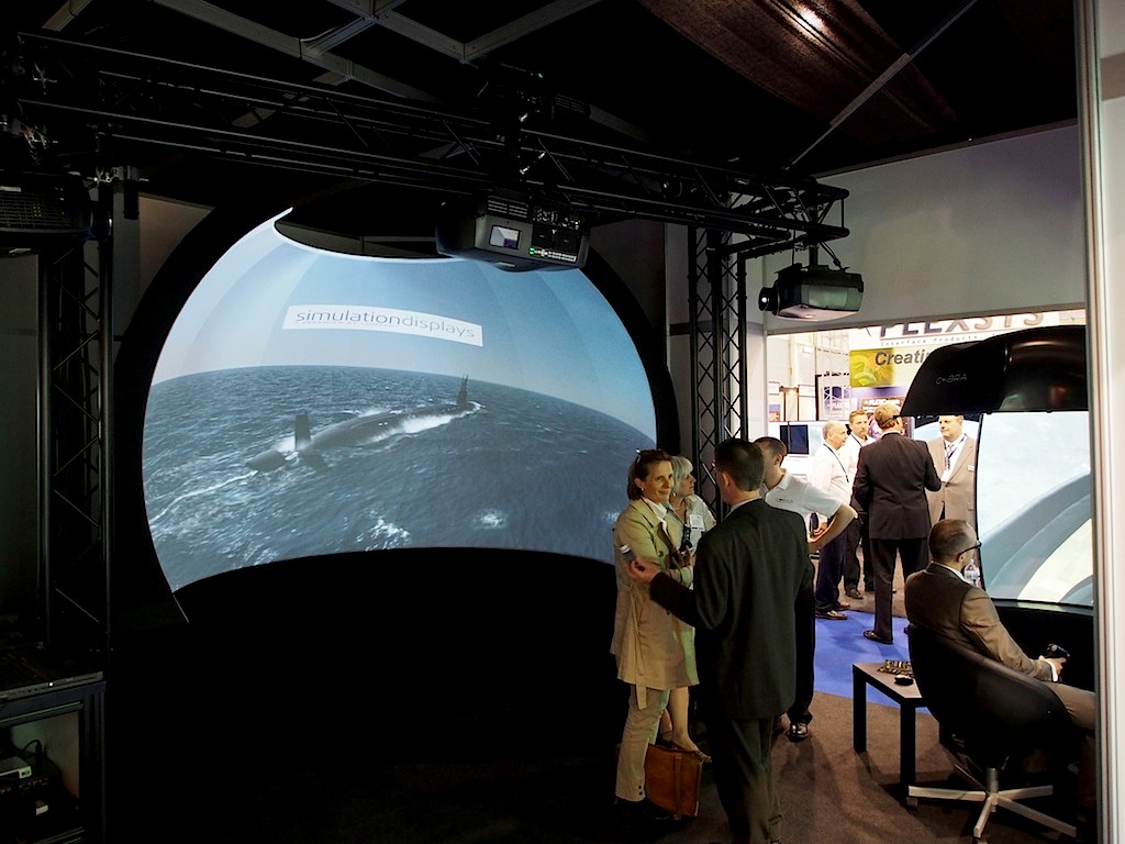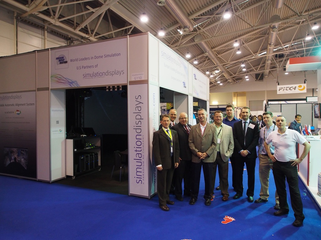 Simulation Displays compartió su espacio en este certamen con la empresa norteamericana Immersive Display Solutions (IDSI), fabricante de pantallas de cúpula inmersivas para entornos 3D y telas de visualización, que conjuntamente mostraron un sistema transportable que puede instalarse en menos de un día, 直径3メートル.
