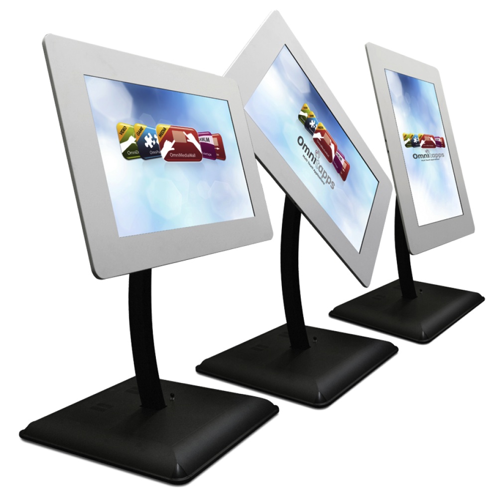 Gracias a las nuevas funcionalidades de Omnitapps, este sistema puede entregar información o mensajes de marketing a las audiencias con múltiples dispositivos táctiles en uno. Una característica clave de este modelo es la función de inclinación de la pantalla táctil, どの角度でも, 水平方向と垂直方向の両方.