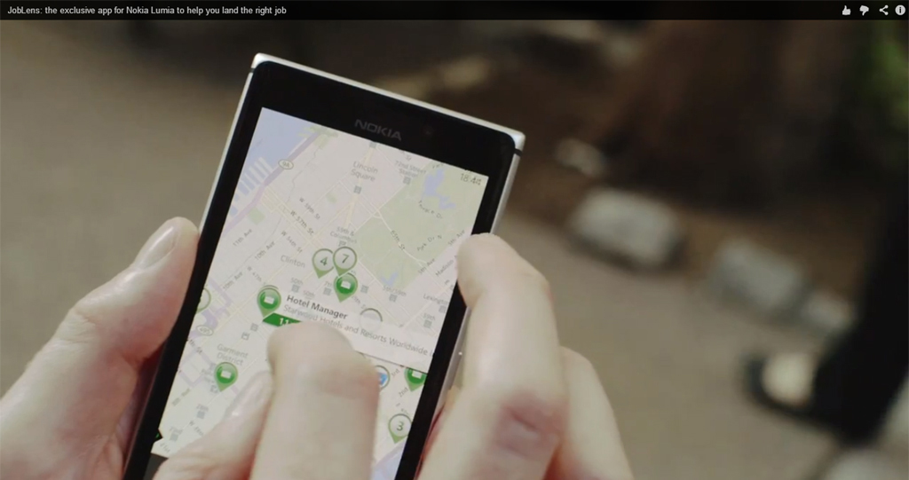 JobLens es la app que ha desarrollado Nokia, utilizando la realidad aumentada, para ayudar a sus usuarios de terminales Lumia a localizar las mejores ofertas de trabajo.