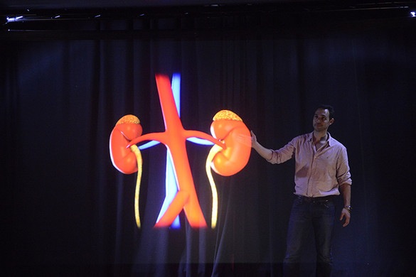 セミナー中, se mostraba el funcionamiento del riñón, en este caso con un holograma 3D de 13 高さメートル, y otras partes de la anatomía humana, incluido un enorme cráneo.