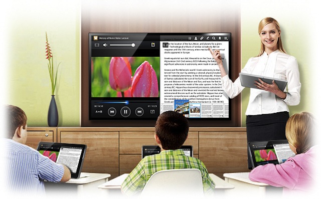Las nuevas aplicaciones de software de colaboración de Samsung permiten que las anotaciones y explicaciones que realice el profesor o los alumnos sobre la pizarra digital, monitor o cualquier tableta se muestren en tiempo real en todos los dispositivos móviles de manera bidireccional; を可能にするコンテンツ, その上, su almacenamiento en los dispositivos de los alumnos.