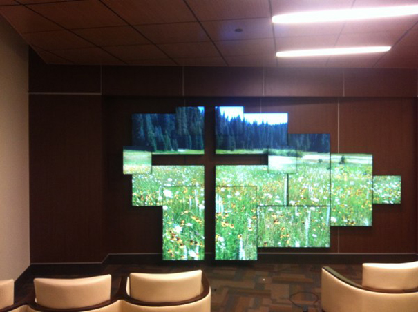 Mosaico Planar es un sistema de pantalla de vídeo que permite a los diseñadores integrar diferentes tamaños y formas de pantallas LCD. このソリューションを使用すると、, los displays no están obligados a estar físicamente adyacentes entre sí permitiendo a los diseñadores e integradores utilizar el espacio negativo en sus diseños. 使用する 15 formas de paneles LCD, cuadrados y rectangulares, es posible crear una estructura en forma de cruz. “結果として , el espacio negativo se convierte en una parte integral de toda la pared, que se suma al efecto y crea serenidad y el mensaje de espiritualidad que el hospital estaba buscando”, aclara Forbes.