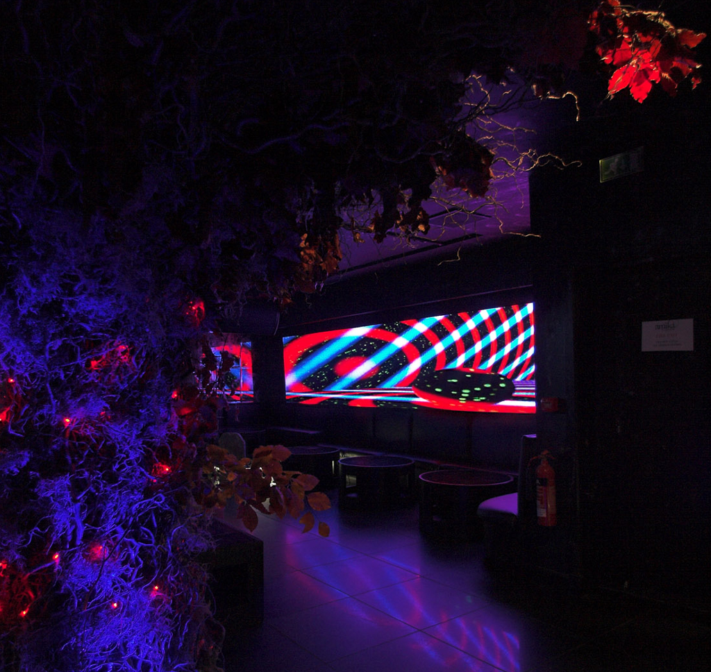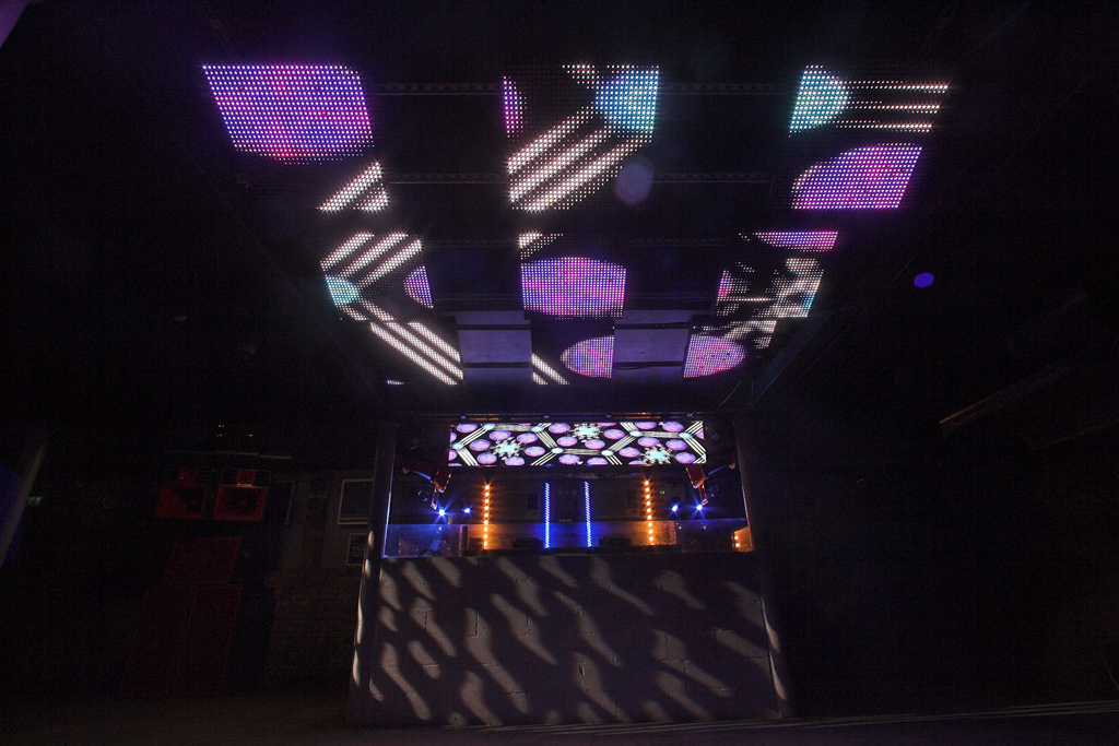 En este local, Emto también ha optado por un modelo outdoor por su robusto acabado y durabilidad. Estas pantallas son utilizadas para efectos strobed, como ayuda para crear la atmósfera que se desea. Para su control, Emto ha suministrando otro sistema GrandVJ ArKaos.