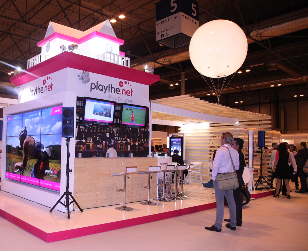 革新的なデザインを提案したPlaythe.netスタンド, 彼らがスマートシティと呼んだもの, 市庁舎を表していました. スタンドの別の部分は、playthe.net カナル・リーガのオファーがあったバーを模倣しました。, バーのテレビの隣に 37 インチのスクリーンを置くソリューション, 両方とも同じ角度にあります. このようにして、サッカーの試合やニュース放送と同時に、playthe.net 画面上で広告放送を見ることができます。,例えば, テレビで. その上, スタンドには3インチのビデオウォールを設置。×3 会社の製品に関する情報を提供するもの.