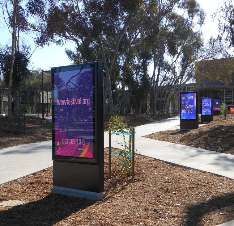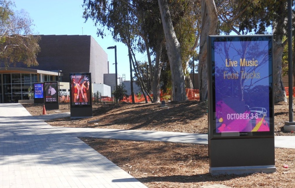 Los primeros Digital Street Furniture LED Display se han instalado en el campus de La Jolla en San Diego, de la Universidad de California, donde funcionan cuatro sistemas desde el inicio del presente curso académico con contenidos del campus, agenda cultural, 活動, イベント, anuncios especiales y también emergencias.
