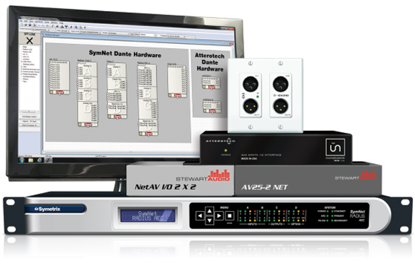 シメトリクス, アテロテック y Stewart Audio se han asociado para simplificar la integración de productos en la estructura de redes Dante de Audinate. このようにして, el software SymNet Composer 2.0 permitirá configurar en una única plataforma los productos de audio de los tres fabricantes equipados con la tecnología Dante de オーディネイト.