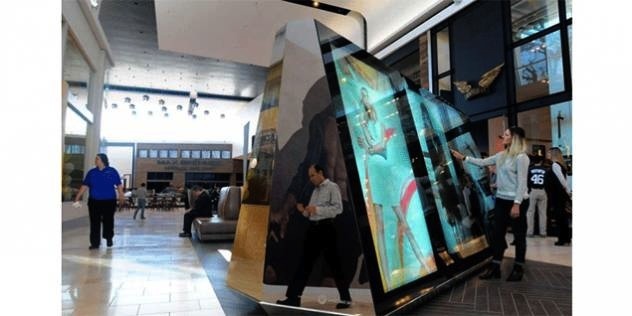 両面インタラクティブディスプレイ, 超高解像度LCDテクノロジーを採用 (4K) そしてタッチテクノロジー, それらのサイズは高さ約 2 メートル、幅約 6 メートルで、大型の透明な仮想ショーケースとして構成されます。, ショッピングセンター内の店舗のあらゆる種類の有名ブランドやアイテムの広告が表示され、ユーザーが欲しいものを選択できるようにする, 彼らの側面には、彼らが置かれている環境の建築要素とデザイン要素が反映されています。.
