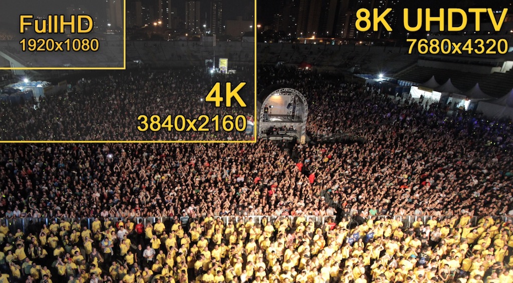 以上 4.000 líneas de escaneado horizontal y una resolución de 7.680×4.320 ピクセル, la tecnología Super Hi-Vision o calidad 8K (UHDV) ha iniciado sus primeras pruebas de captación y emisión en el actual Mundial de Futbol Brasil 2014, de la mano de la empresa de medios japonesa NHK, en colaboración con Globo TV.