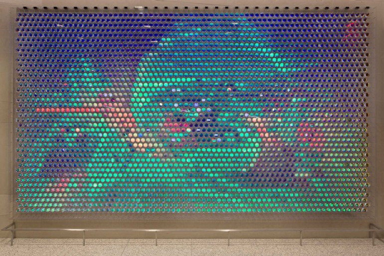 Esta obra de arte digital ha sido realizada a medida y pensada para que parezca que está flotando frente a la pared. Encerrada en una estructura acrílica transparente, ofrece un robusto soporte y permite que la sustitución de las modulares ‘mini pantallas’ sea un proceso sencillo de realizar desde la parte frontal. Secciones de las pantallas pueden ser movidas y reemplazados fácilmente.
