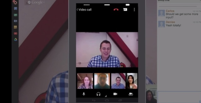 Los clientes de Google Apps pueden iniciar o unirse a una videoconferencia en HD que conecta ahora hasta a quince participantes a través de PC o el dispositivo Chromebox, y en breve vía móvil y tablets. このために, esta compañía se ha asociado con nuevos proveedores, として Blue Jeans, que permitirá que los usuarios empresariales que utilizan sistemas de videoconferencia tradicionales basados en H.323 o SIP puedan unirse; 同様に InterCall, que facilita las videoconferencias a través de los smartphones mediante un puente de audioconferencia de este última compañía.