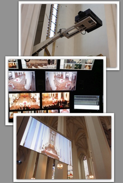 Además de las cámaras para primeros planos y las de media distancia, se utiliza el modelo AK-HC1800 de Panasonic, con un cabezal de giro e inclinación AW-PH400 para tomas a larga distancia (より多い 70 地下鉄) desde la galería en la que se sitúa el órgano. El sistema se controla desde una sala ubicada en el sótano, donde se utiliza un mezclador de producción AV-HS450 de este proveedor con una superficie de control a medida especial.