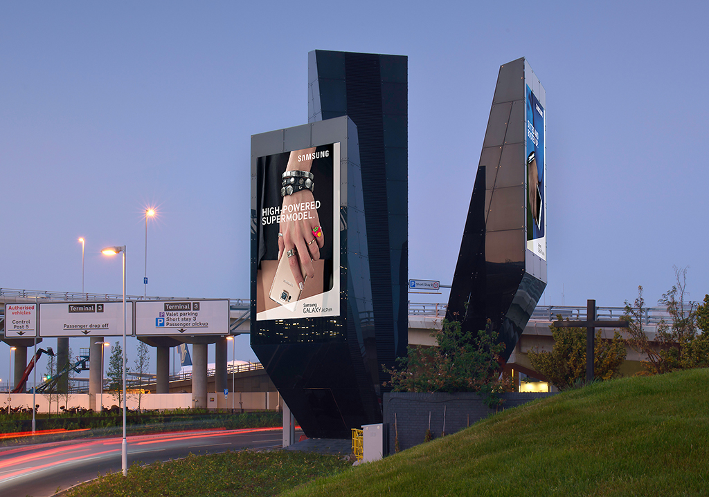 Grandview はヒースロー空港で最も著名な屋外デジタル広告媒体です. これは、ターミナルへの主要な入り口ルートの上に位置する、三角錐のプラットフォームです。 2 y 3, そしてT2の出発. 3方向から乗客の注目を集める戦略的な場所.