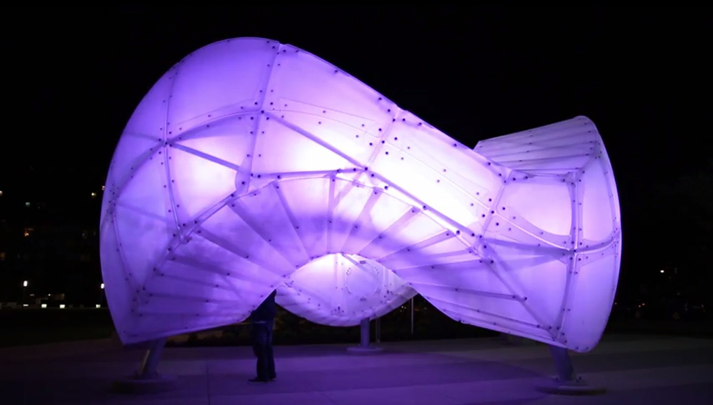 Chinook Arc es una escultura interactiva, construida con materiales acrílicos y dotada de tecnología LED y sensores, que permite que los visitantes se conviertan en participantes activos de la experiencia, cambiando la secuencia de iluminación a través de sus movimientos.