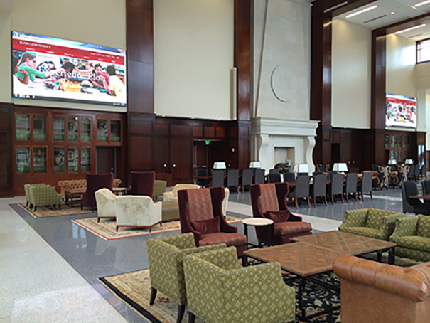Cuando la Universidad de Elon en Carolina del Norte comenzó a diseñar su Great Hall en el Global Neighborhood sabían que este área de reuniones tenía que ofrecer una nueva experiencia a sus estudiantes de forma que les invitara a visitar a diario la estancia. Dada la arquitectura y estética de esta habitación, la instalación de un sistema de proyección de vídeo no era posible por lo que optaron por implantar una solución de visualización de gran formato basada en la tecnología de ナノルーメン.