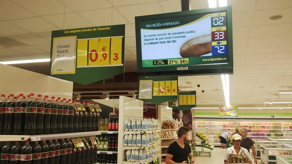 インテグレータ DJ3 カナリア諸島 ha puesto en marcha el circuito de publicidad dinámica y canal TV en un nuevo establecimiento de la cadena de alimentación en Gran Canaria, que se basa, al igual que en el proyecto audiovisual realizado en otros supermercados del Grupo Dinosol en las Islas Canarias, en pantallas profesionales de la Serie V de NECディスプレイソリューションズ.