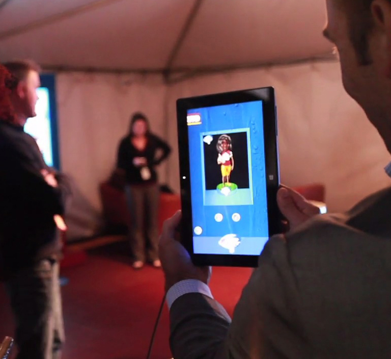 Esta transformación también la pueden realizar utilizando una de las múltiples tablets マイクロソフト Surface Pro 3 que hay dispuestas por el salón y que incorporan la tecnología Virtual BobbleHead.