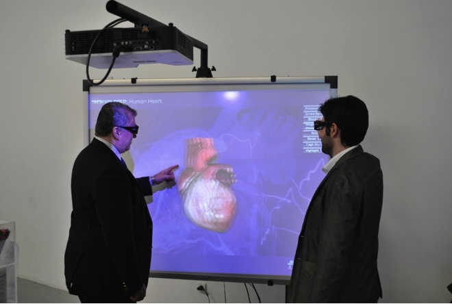 同社は、教室で投影される 3D 画像を使用した教育コンテンツを備えたデジタル ホワイトボードの有用性についてもさらに一歩前進しました。. そのためには技術的な対策が必要です, DLP-3D Ready プロジェクターとして, Nvidia Quadro グラフィックス カードを搭載したコンピューター 410 の 512 学生向け MB およびアクティブ 3D メガネ.