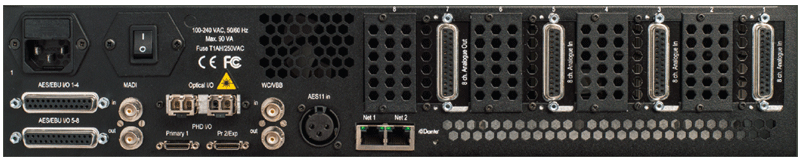 AX32 は最大で管理できます 48 アナログオーディオチャンネル (入力と出力を含む), AES3 フォーマットのデジタル入出力を組み込みます。 (それまで 16 経由チャネル 2 DB25コネクタ) そしてマディ (それまで 64 BNCコネクタ付きチャンネル), さらに、オプションのギガビット イーサネット インターフェイスにより、管理が可能になります。 64 PC用Dante仮想サウンドカード経由のオーディオチャンネル, Mac およびその他の Dante 互換デバイス.