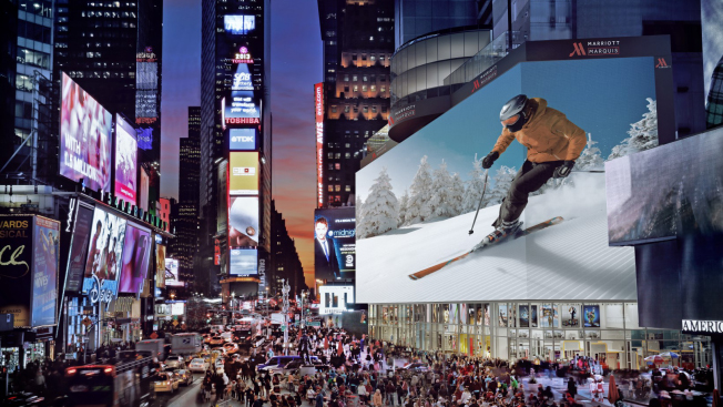 ニューヨークで最も繁華なエリアでは、サッカー場ほどの大きさのスクリーンから通行人を捉える