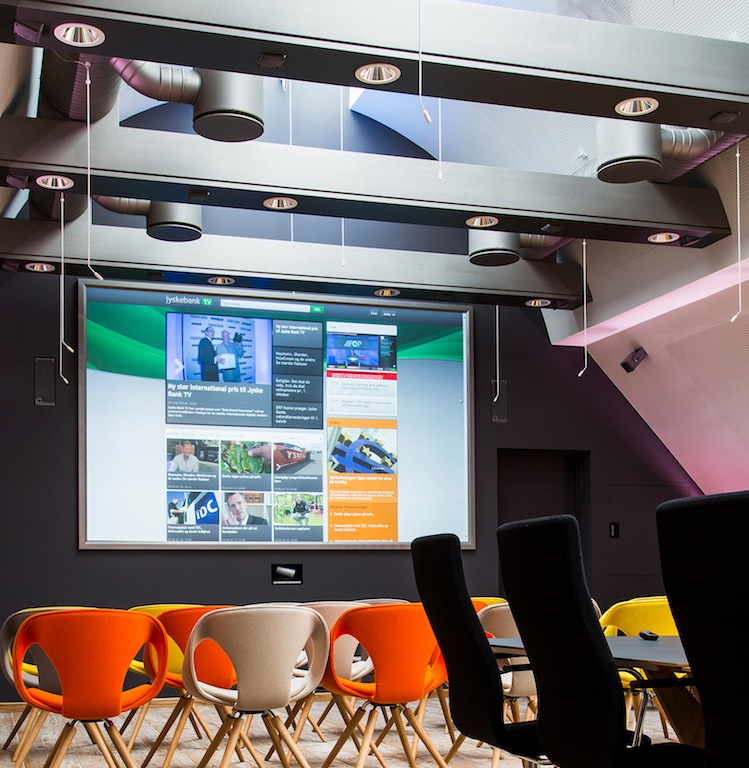 Así lo explica Steen Mertz, director TIC de Jyske Bank: “sabíamos que la habitación en sí era ya un desafío, ya que es larga y estrecha, con un techo bajo acristalado y mucha luz natural procedente de esta gran ventana y de las claraboyas, lo que suponía un reto añadido para la instalación de un sistema visual de alta calidad, fácil de utilizar y que armonizara con el diseño interior de la sala, tal y como queríamos”.