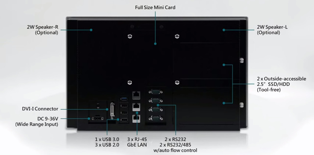 Estos paneles de Arbor Technology incorporan el procesador Intel Celeron J1900 Quad-Core que proporciona una gran frecuencia de operación. Carentes de ventilador, dispone de una amplia gama de conectores localizados en la parte trasera: una salida de vídeo DVI-I, tres Giga LAN, 4 プエルトスUSB (1 USB 3.0 y 3 USB 2.0) y 4 COM. También incorpora dos altavoces de 1,5W.