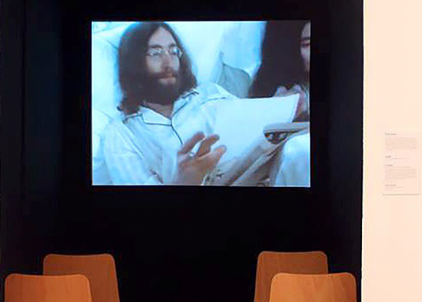 Sobre esta, Vitelsa ha diseñado e instalado en altura una estructura articulada con un sistema de sonorización y un equipo HD de alta luminosidad que proyecta, de forma cenital y sobre la ropa de cama, el vídeo Give Peace a Chance y el documental Bed Peace, recreando ante el visitante la famosa puesta en escena de la carismática pareja.