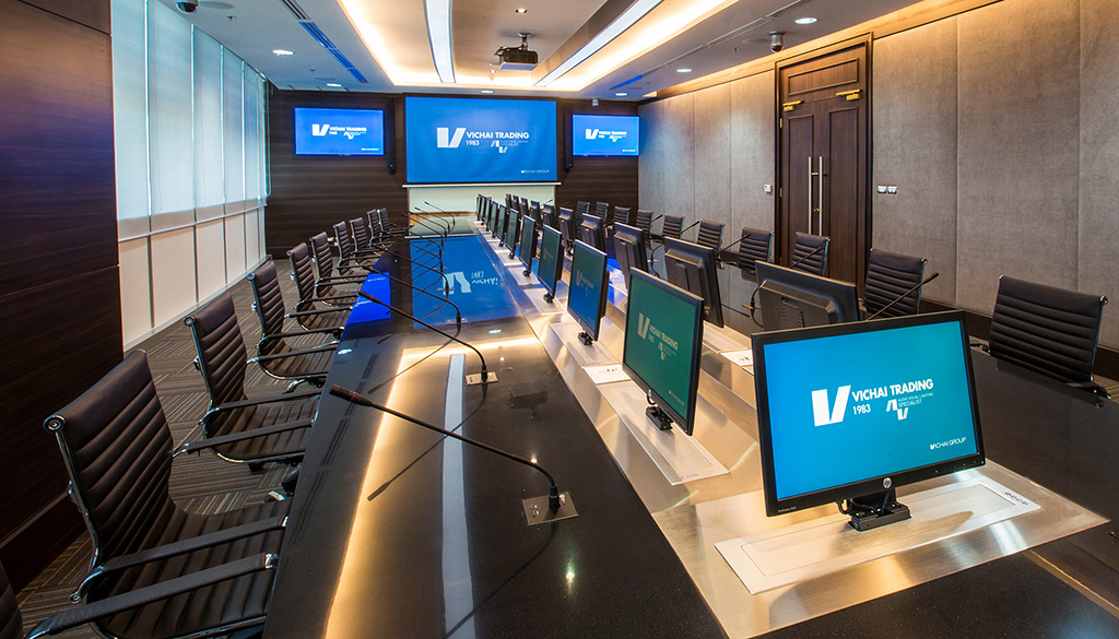 タイ政府宝くじ局宛, この新しい本社の最も重要な部分は会議室です, 床にあります 11 建物の. とても明るい空間です, 自然光と人工光の両方の影響を受ける, プレゼンテーションやその他の AV デバイス用のスクリーンが多数あります。, でも、部屋に主役となるスクリーンも設けたいと考えました。.