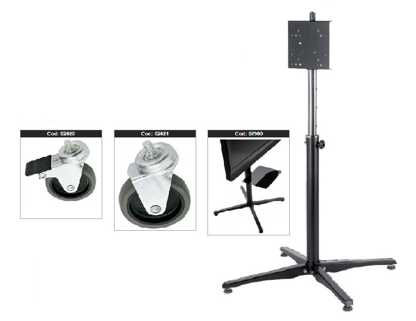 Con una altura ajustable de 1.250 ある 1.650 mm y con un peso máximo de 50 kilos está construido para que los apoyos del suelo puedan ser reemplazados por ruedas especiales, permitiendo la opción de añadir un estante especial para equipos de control/decodificadores.